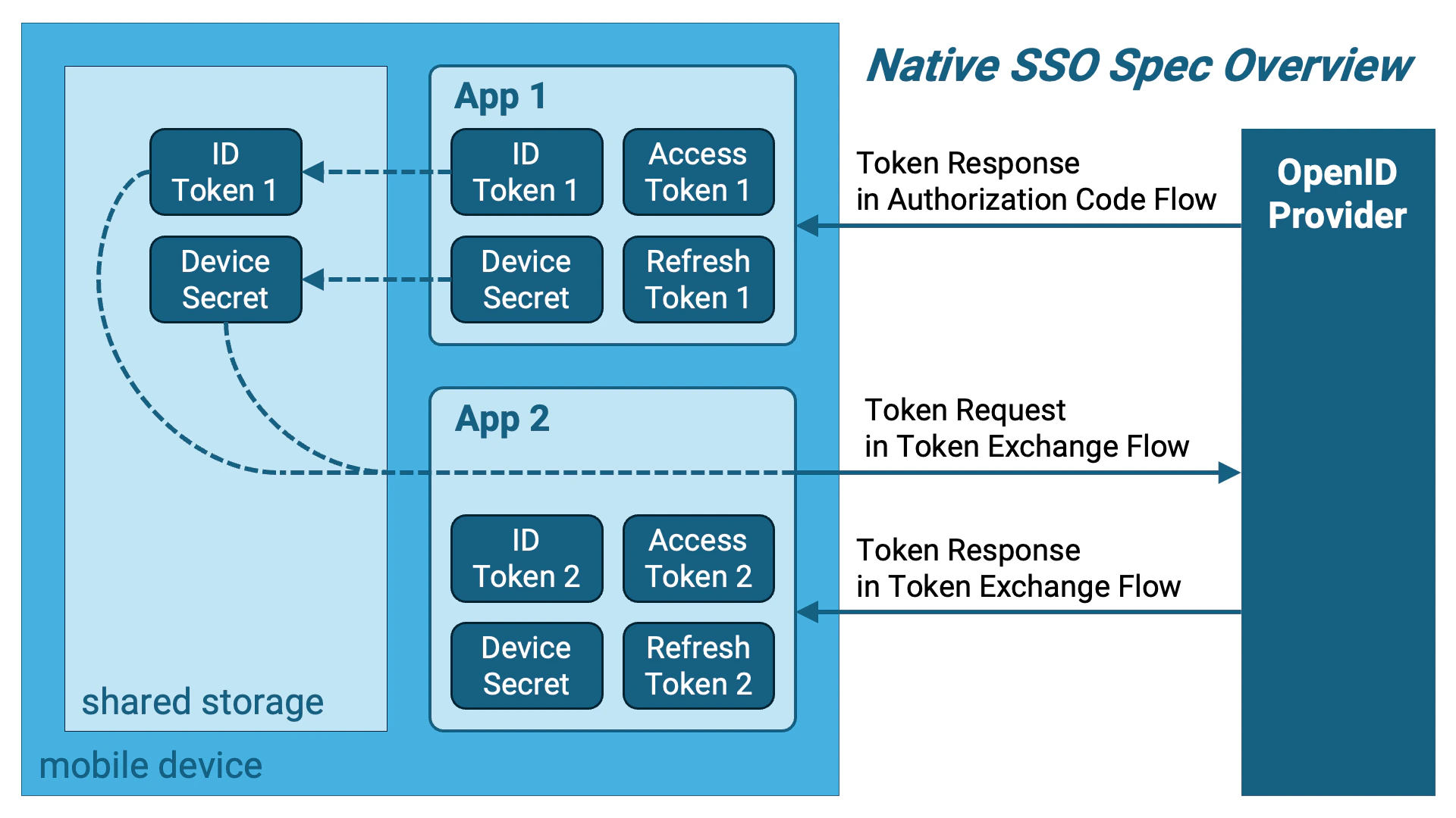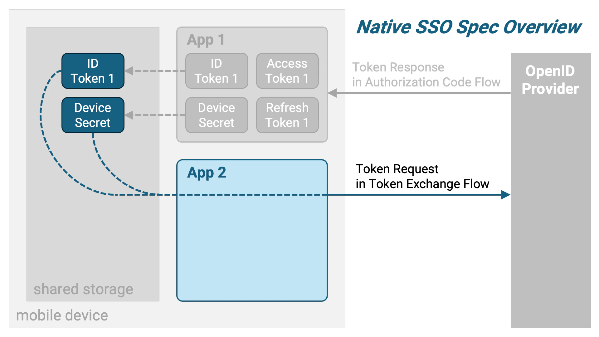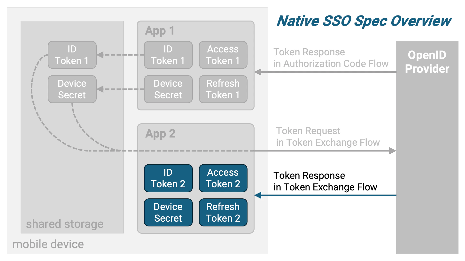 Native SSO仕様は、RFC 8693: OAuth 2.0 Token Exchange仕様を拡張し、Native SSOを実現するための要求事項を追加しています。 二つ目のアプリケーションは、一つ目のアプリケーションが保存したIDトークンとデバイスシークレットを取り出し、それらを用いてNative SSO仕様に準拠するトークン交換リクエストを組み立てます。RFC 8693については、解説記事『RFC 8693 OAuth 2.0トークン交換』もご参照ください。