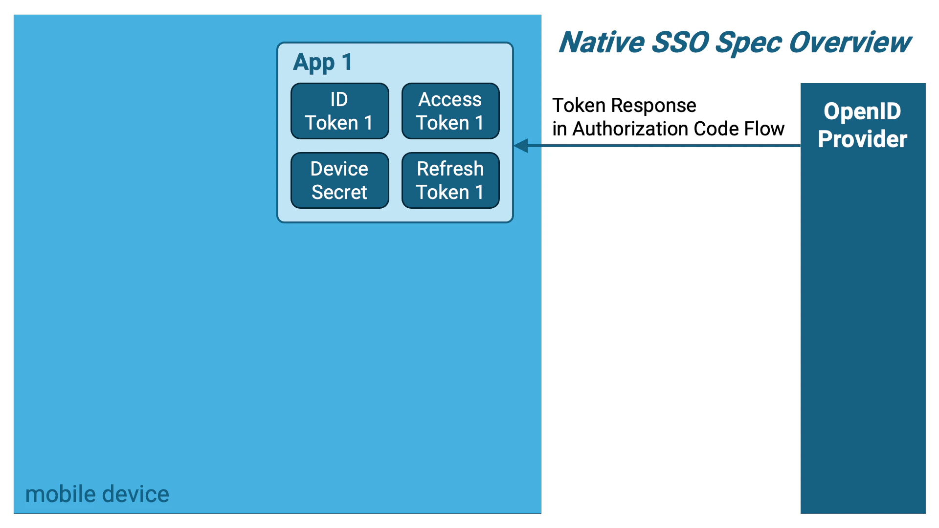 詳細に踏み込む前に、仕様の概要を紹介します。 まず、一つ目のアプリケーションが認可コードフローを用いて下記のトークン群を取得します。注目すべき点は、IDトークンがNative SSO仕様に準拠していること、および、デバイスシークレットという新しいタイプのトークンが含まれていることです。- アクセストークン
