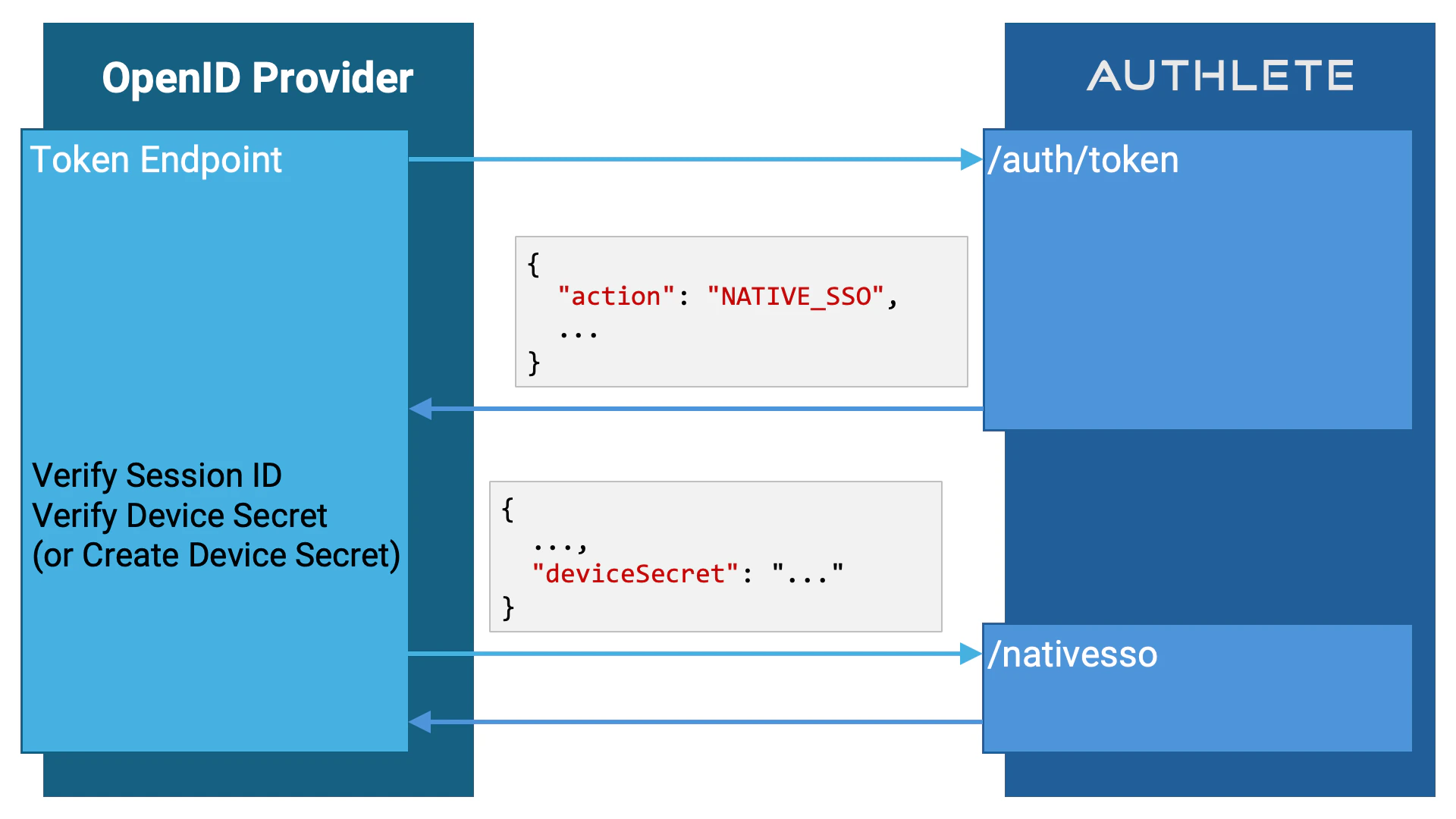 actionの値がNATIVE_SSOの場合、トークンエンドポイントの実装はトークンリクエストの処理を完了させるために/nativessoAPIをコールする必要があります。しかし、それに先立ち、セッションIDやデバイスシークレットの検証、必要に応じてデバイスシークレットの生成を行わなければなりません。