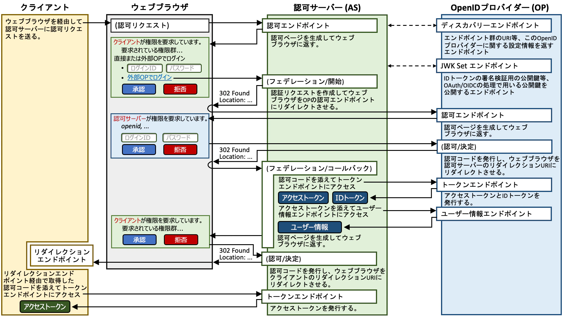 Locationヘッダーをつけて302 Found(リダイレクションを促すものであれば何でもよい) をウェブブラウザに返す。これによりウェブブラウザは (クライアントのものではなく) AS のリダイレクション URI に認可コード付きでアクセスする。IdP の視点からは、AS はクライアントアプリケーションであり、当該リダイレクション URI は AS が事前に IdP に登録しておいたものの一つである。 - AS のリダクレションエンドポイント (図中の「フェデレーション/コールバック」) が認可コードを受け取る。