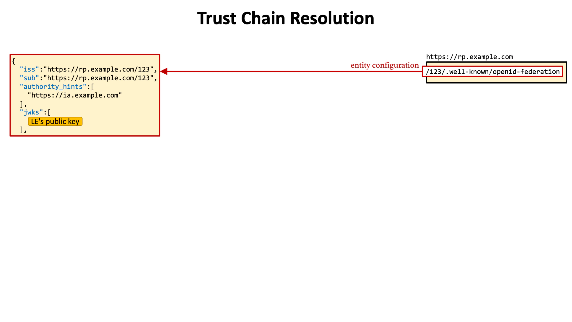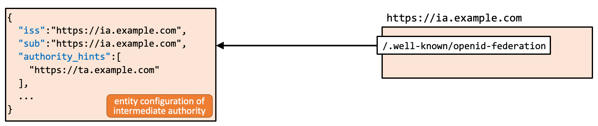 For example, when a relying party whose entity ID is https://rp.example.com/123 has a direct intermediate authority whose entity ID is https://ia.example.com, the authority_hints claim in the entity configuration of the relying party contains https://ia.example.com.