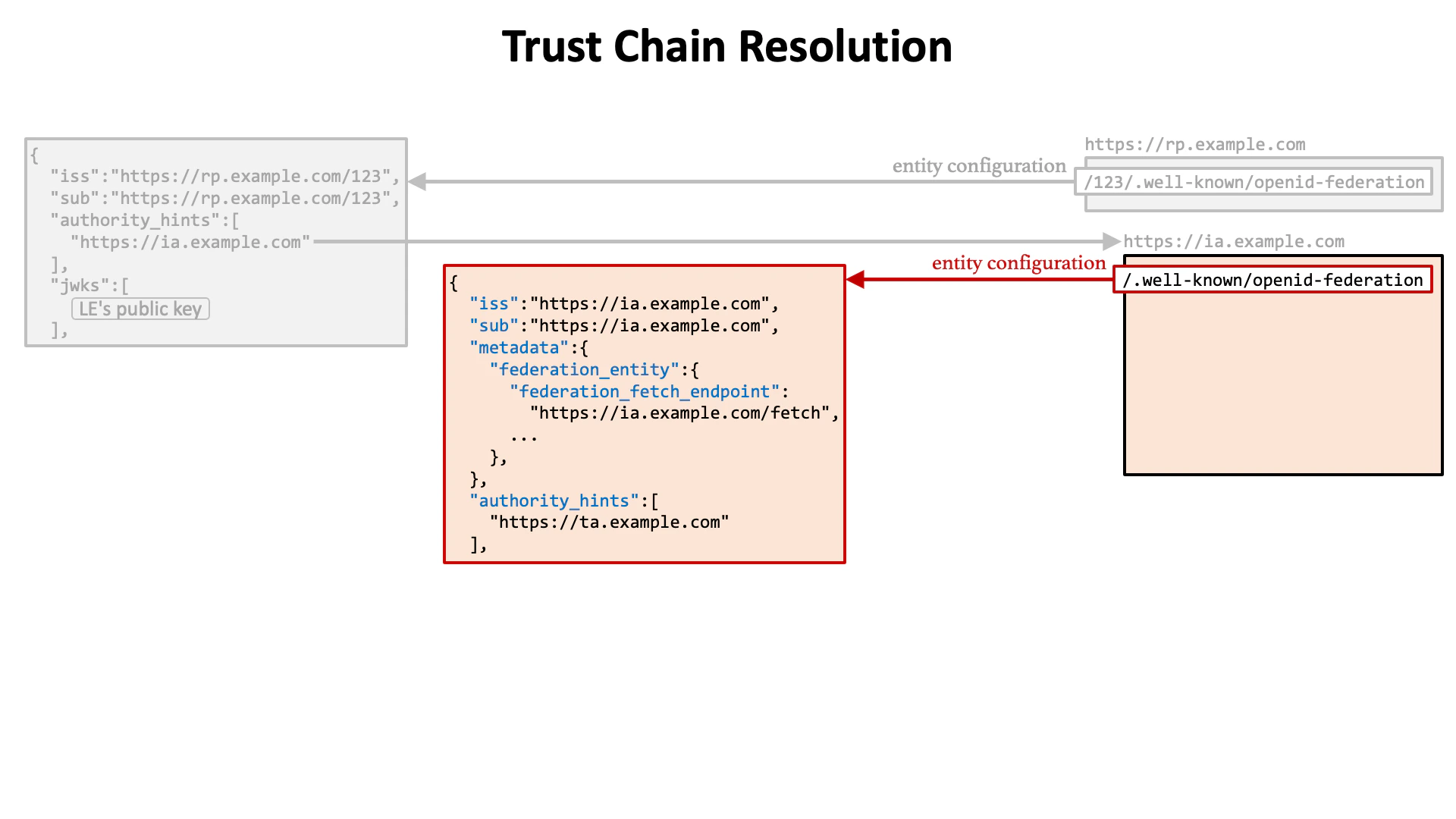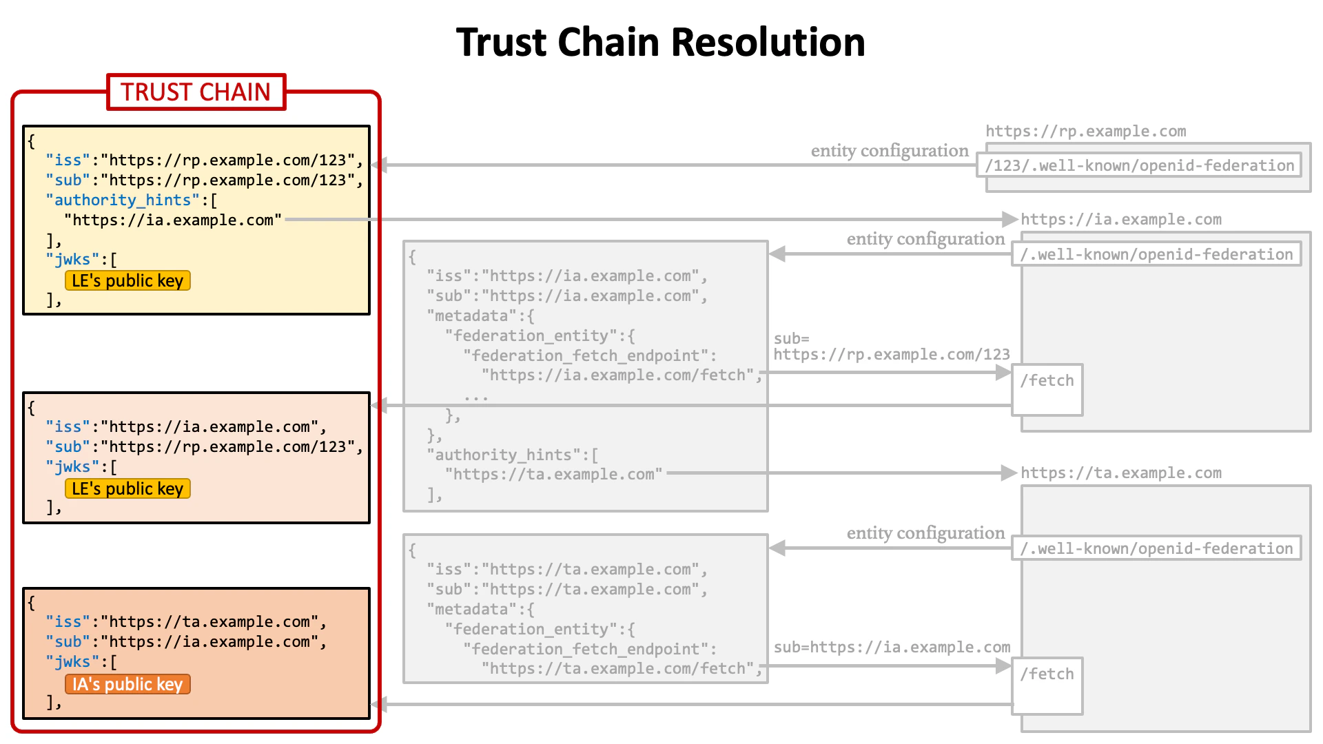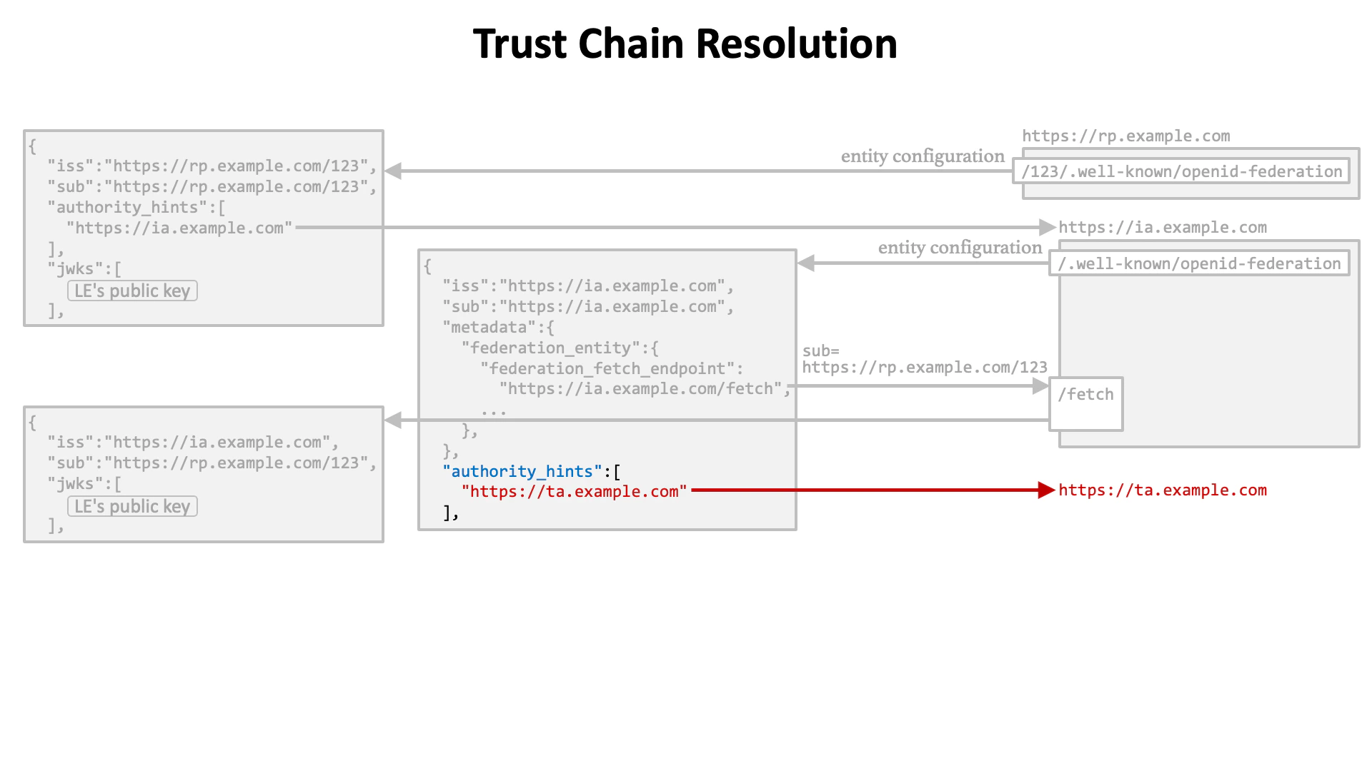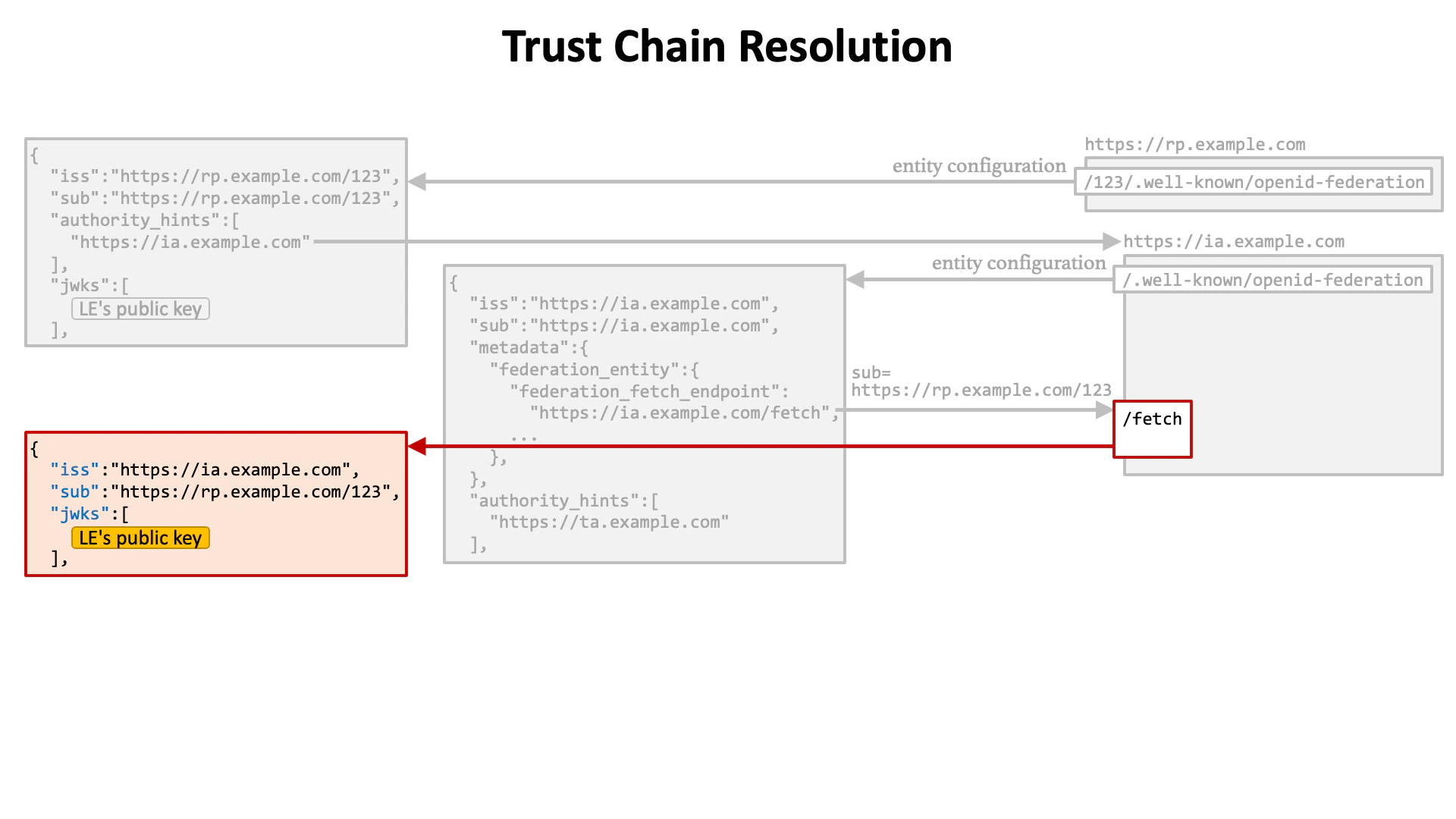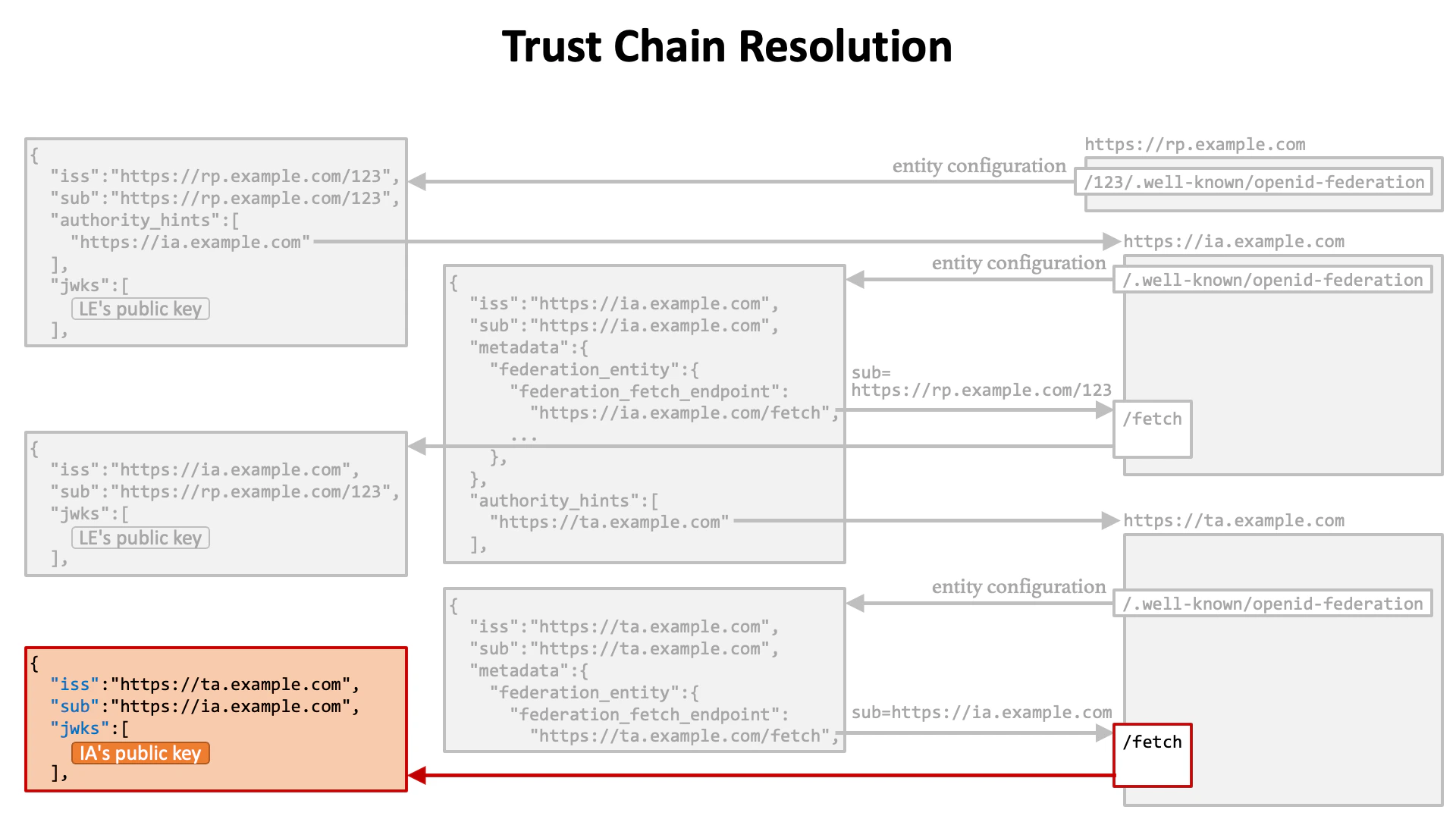 Let’s review the flow of trust chain resolution. (1) The first step is to get the entity configuration of a leaf entity.