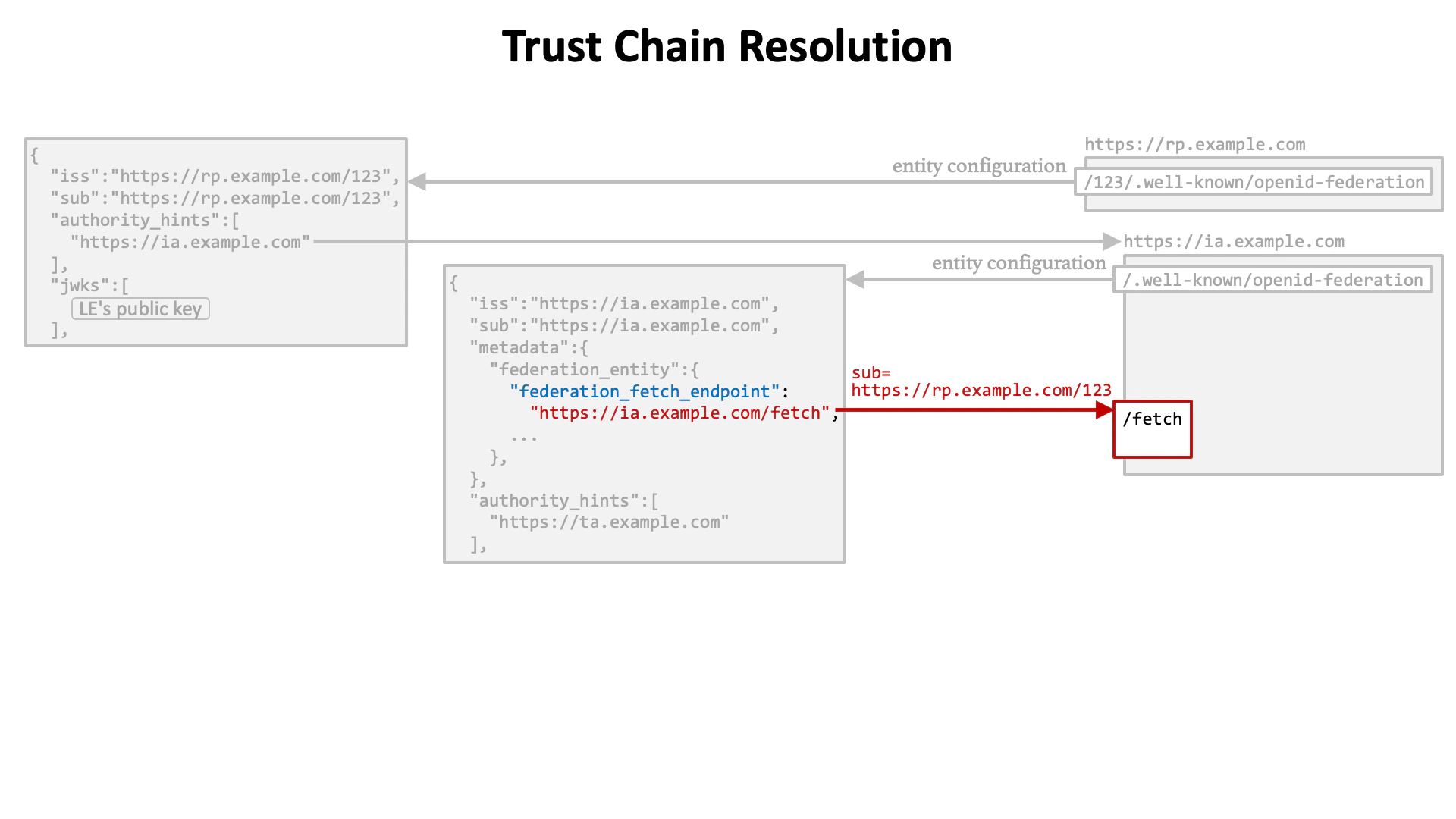sub request parameter is sent to the federation fetch endpoint. In this example, the entity ID of the leaf entity (https://rp.example.com/123) is specified as the value of the sub request parameter.