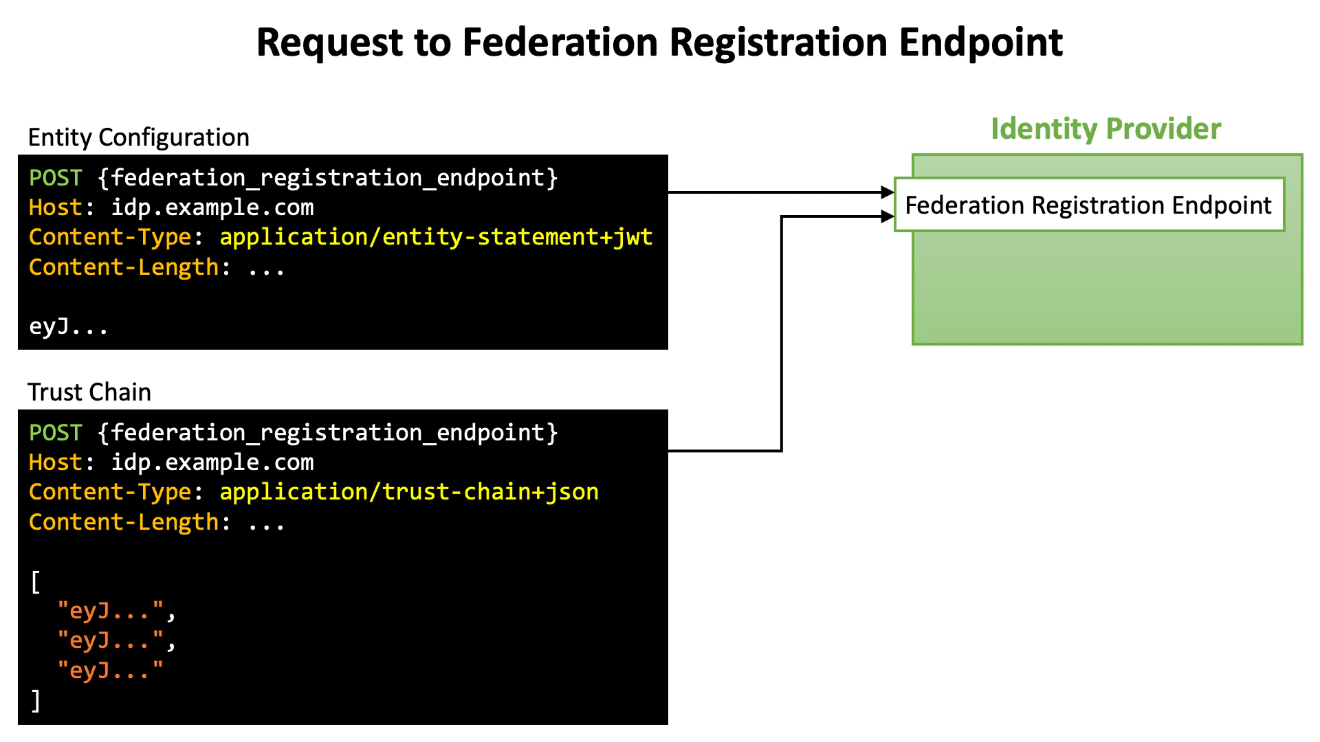 application/entity-statement+jwt. - Trust chain, a JSON array listing entity statements. Its Content-Type is