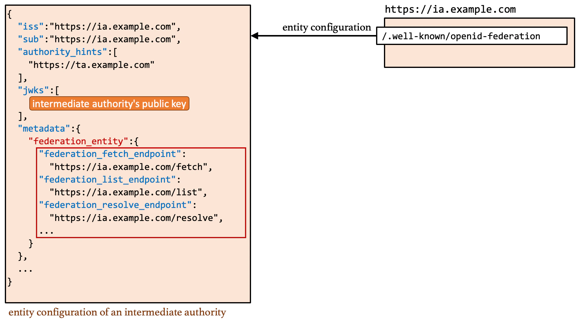 authority_hints claim. It is a JSON array listing entity IDs of intermediate authorities or trust anchors. Web servers of authorities can be identified by the entity IDs. In this example, an intermediate authority https://ia.example.com is included in the authority_hints claim.