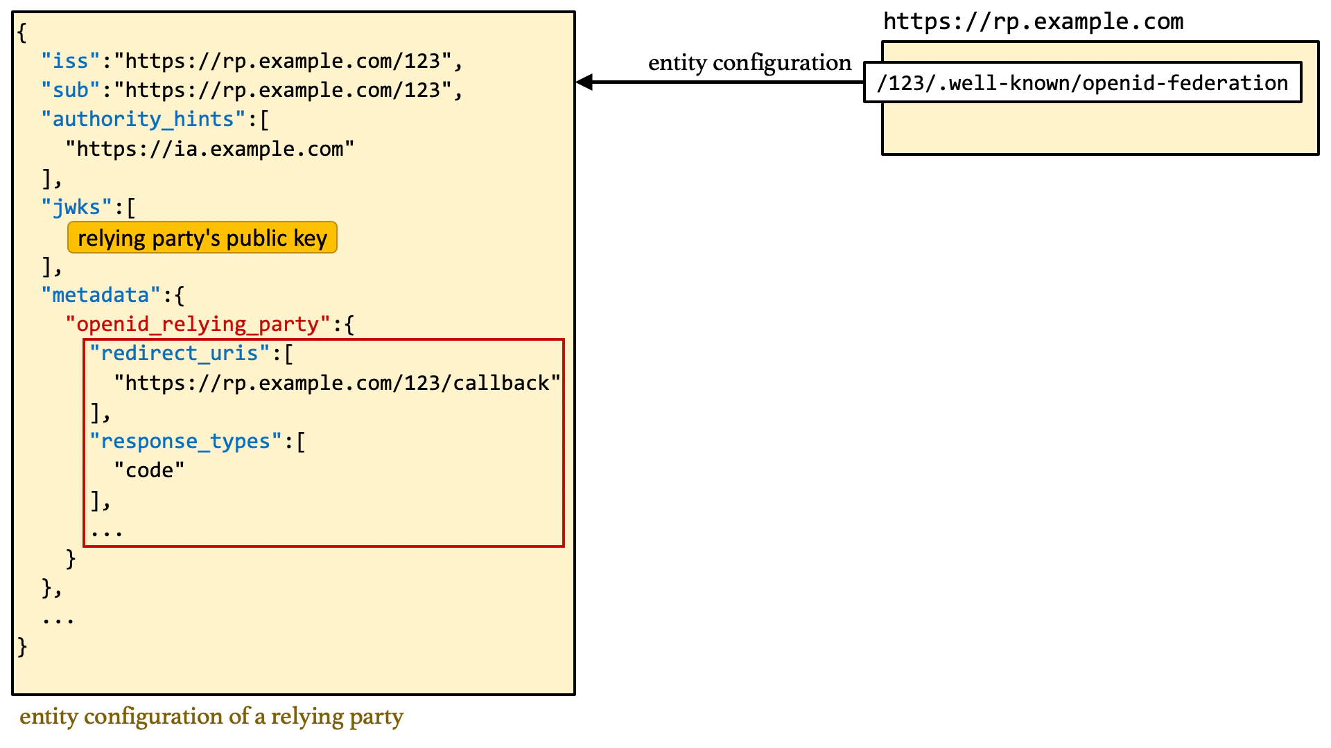 For instance, when the entity ID of a relying party is https://rp.example.com/123, the self-signed JWT of the relying party is expected to be published at the following URL.