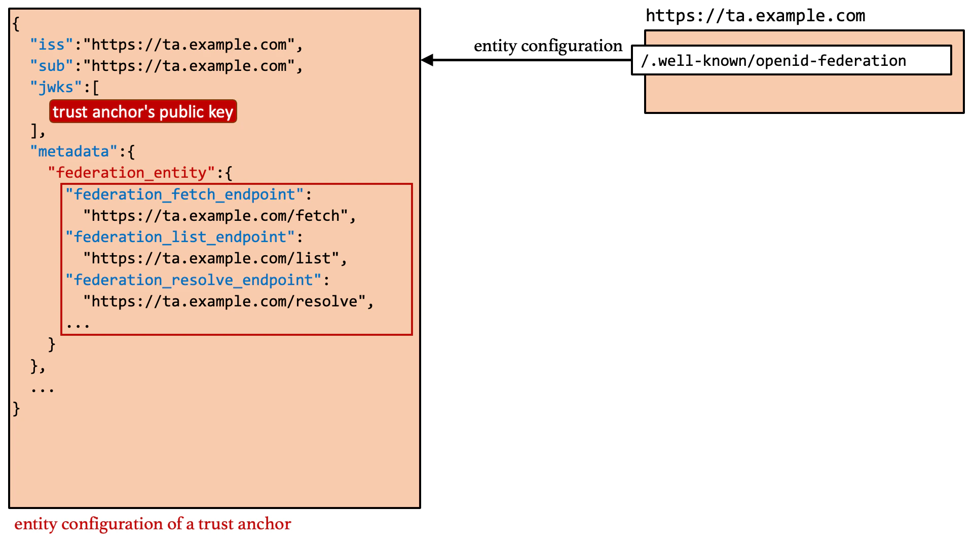 sub claim is the last intermediate authority’s identifier and the value of the iss claim is the trust anchor’s identifier. If no intermediate authorities are involved, the trust anchor issues a JWT that directly authorizes the leaf entity. In that case, the sub claim holds the leaf entity’s identifier.