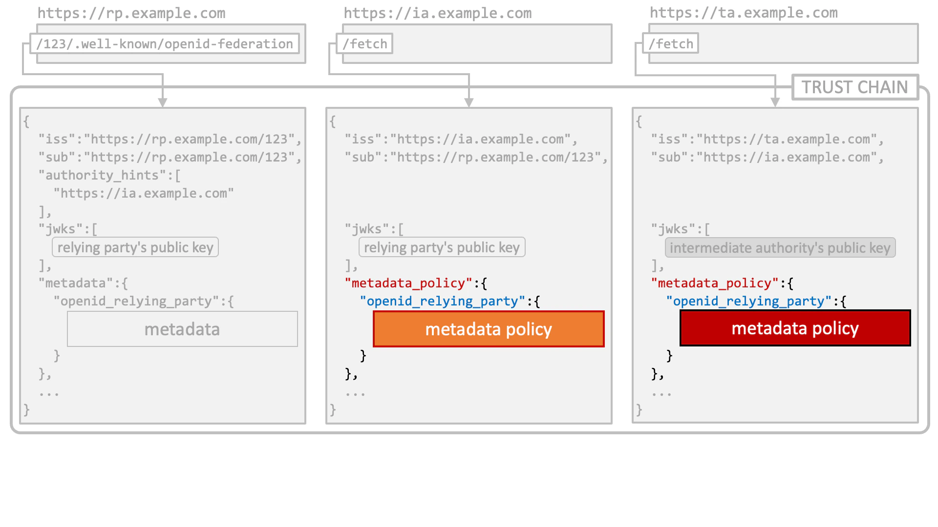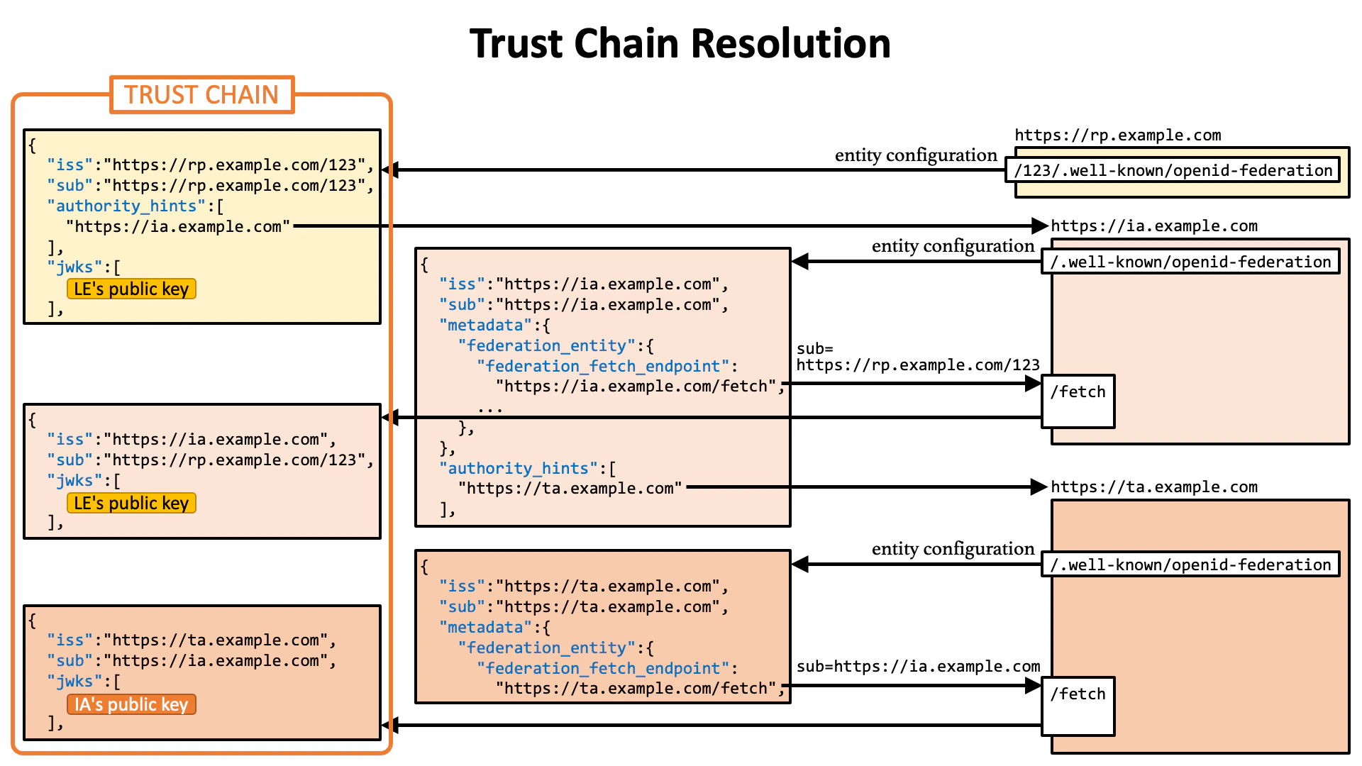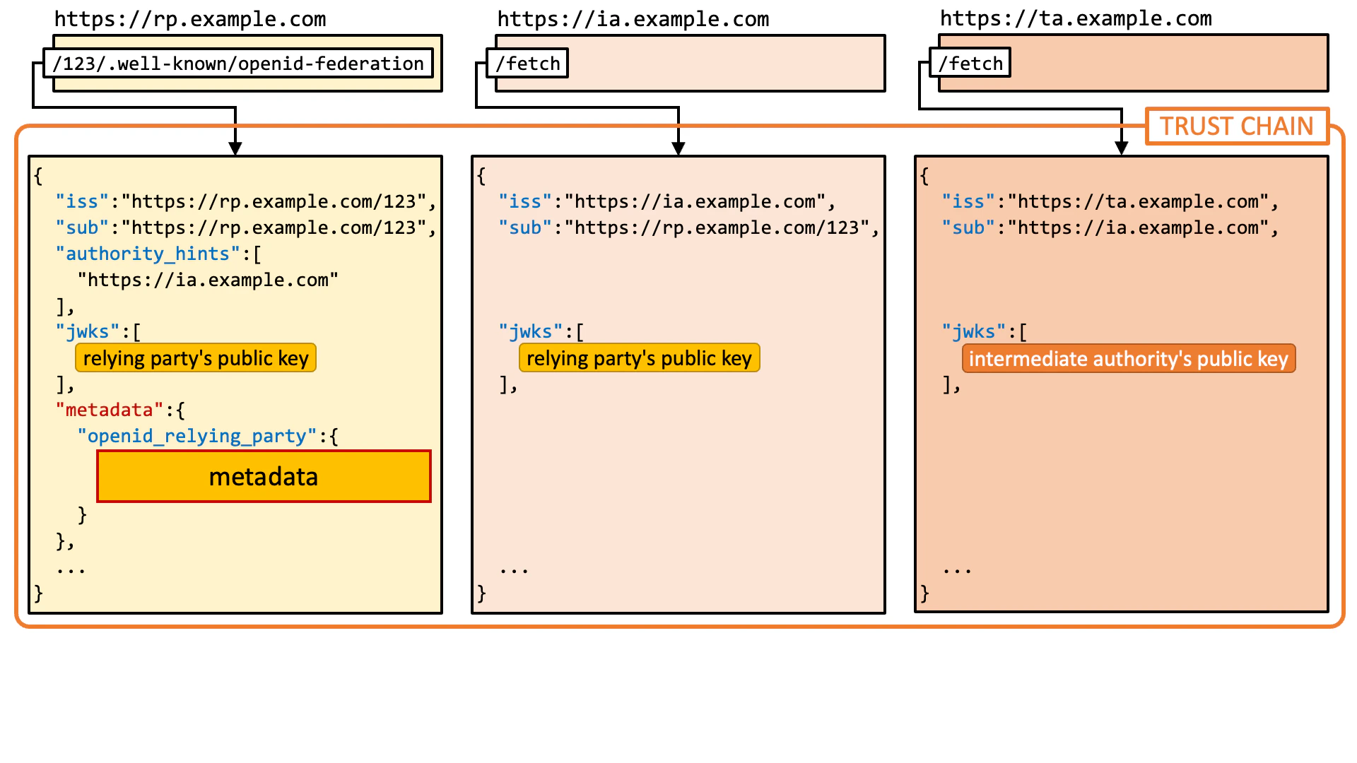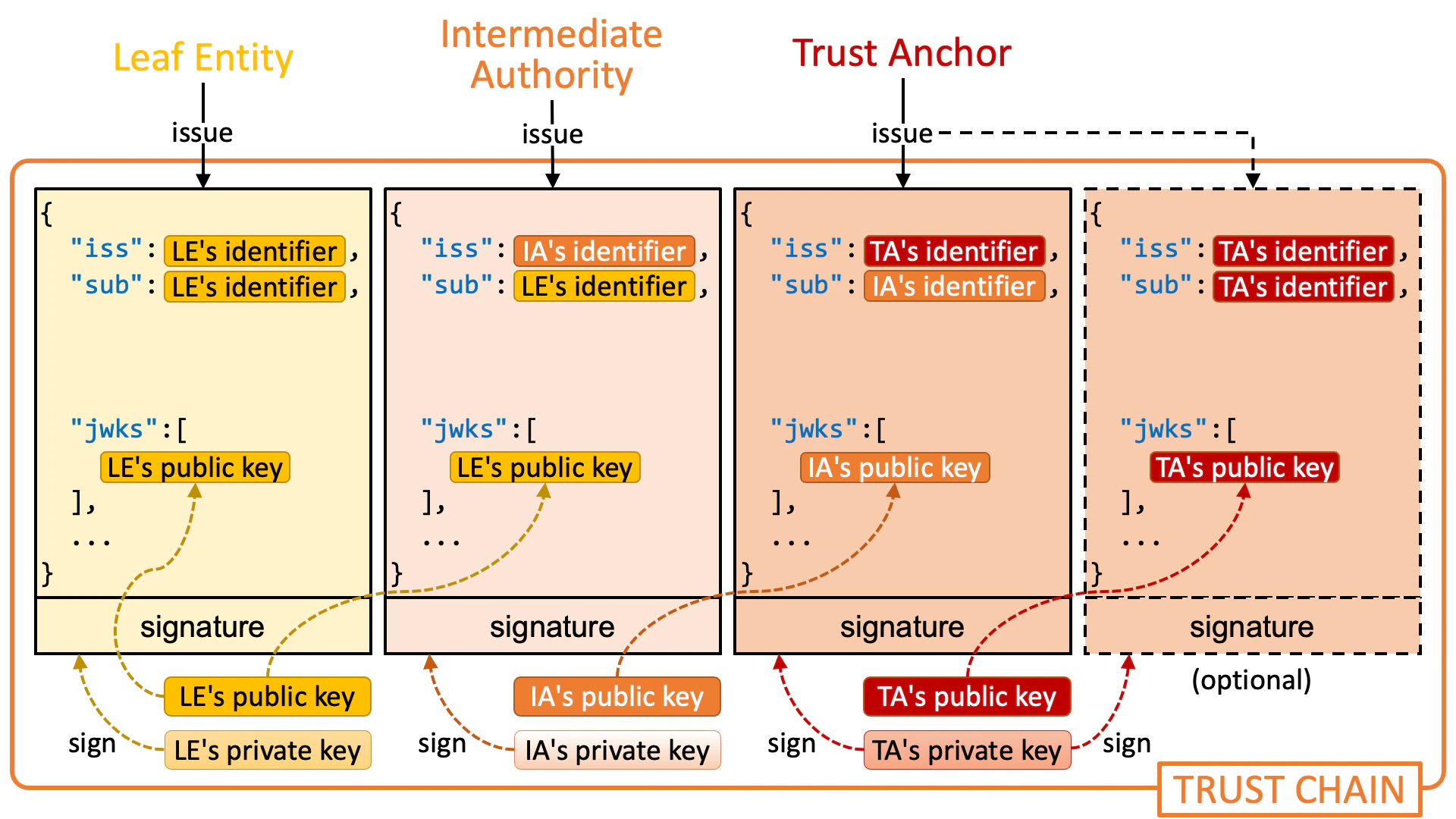 Technically speaking, a trust chain is a sequence of JWTs (RFC 7519 JSON Web Token) that are issued by a leaf entity, zero or more intermediate authorities, and a trust anchor.JWT Issued by Leaf Entity