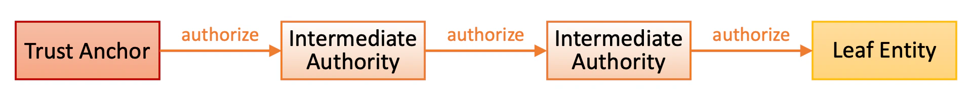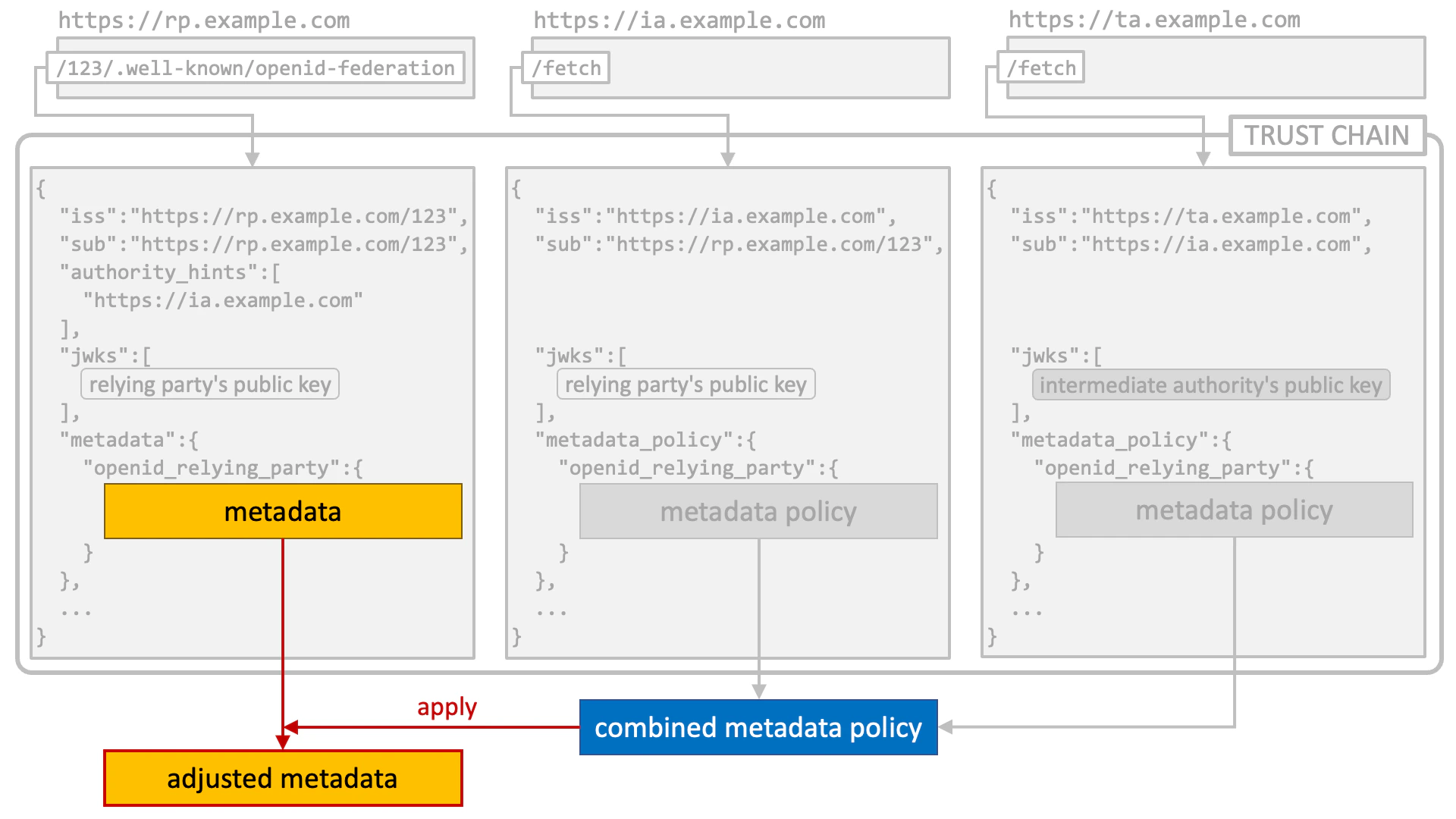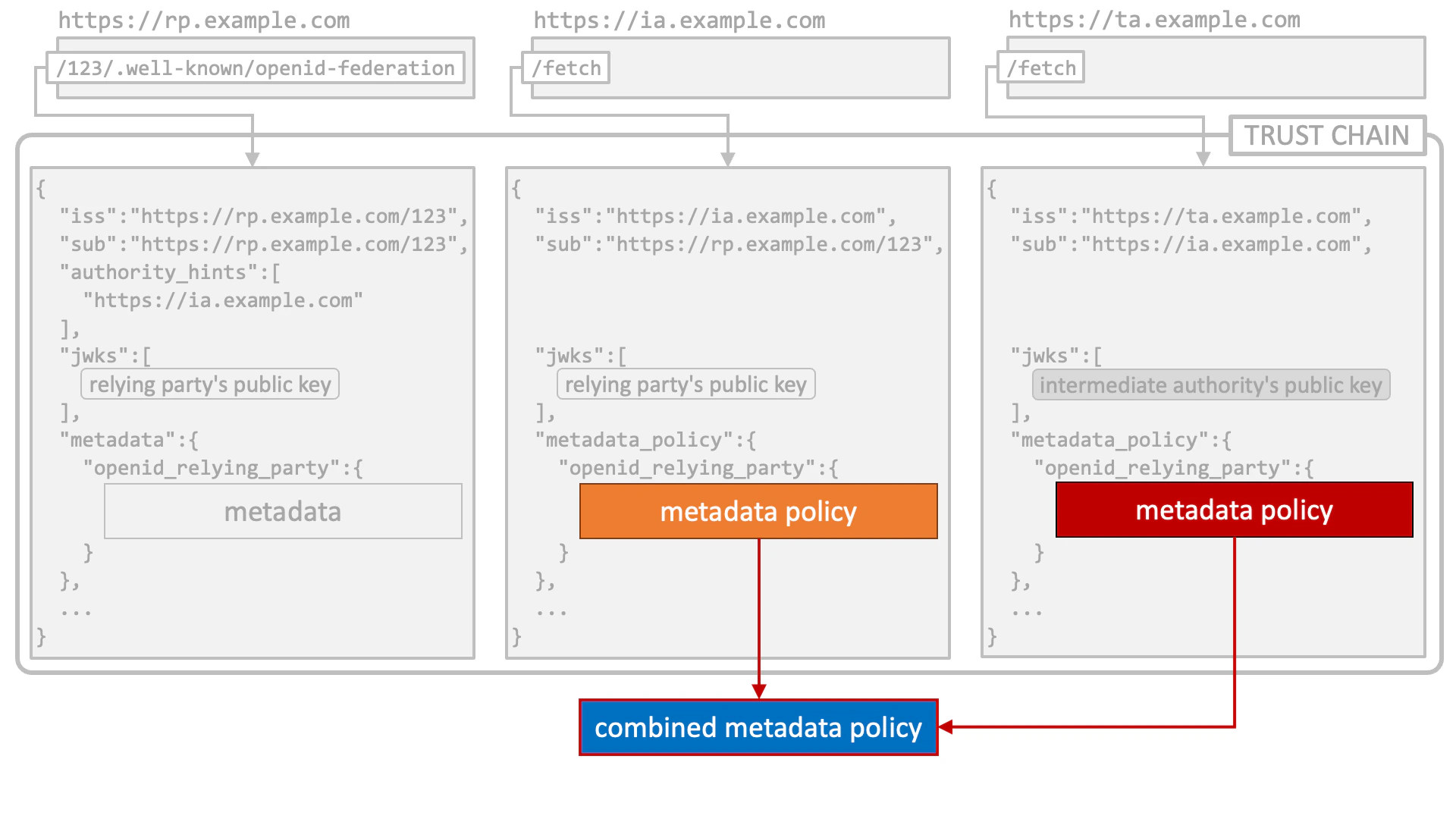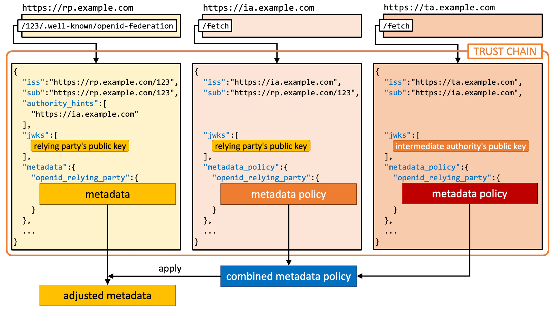 Technically speaking, a trust chain is a sequence of JWTs (RFC 7519 JSON Web Token) that are issued by a leaf entity, zero or more intermediate authorities, and a trust anchor.JWT Issued by Leaf Entity