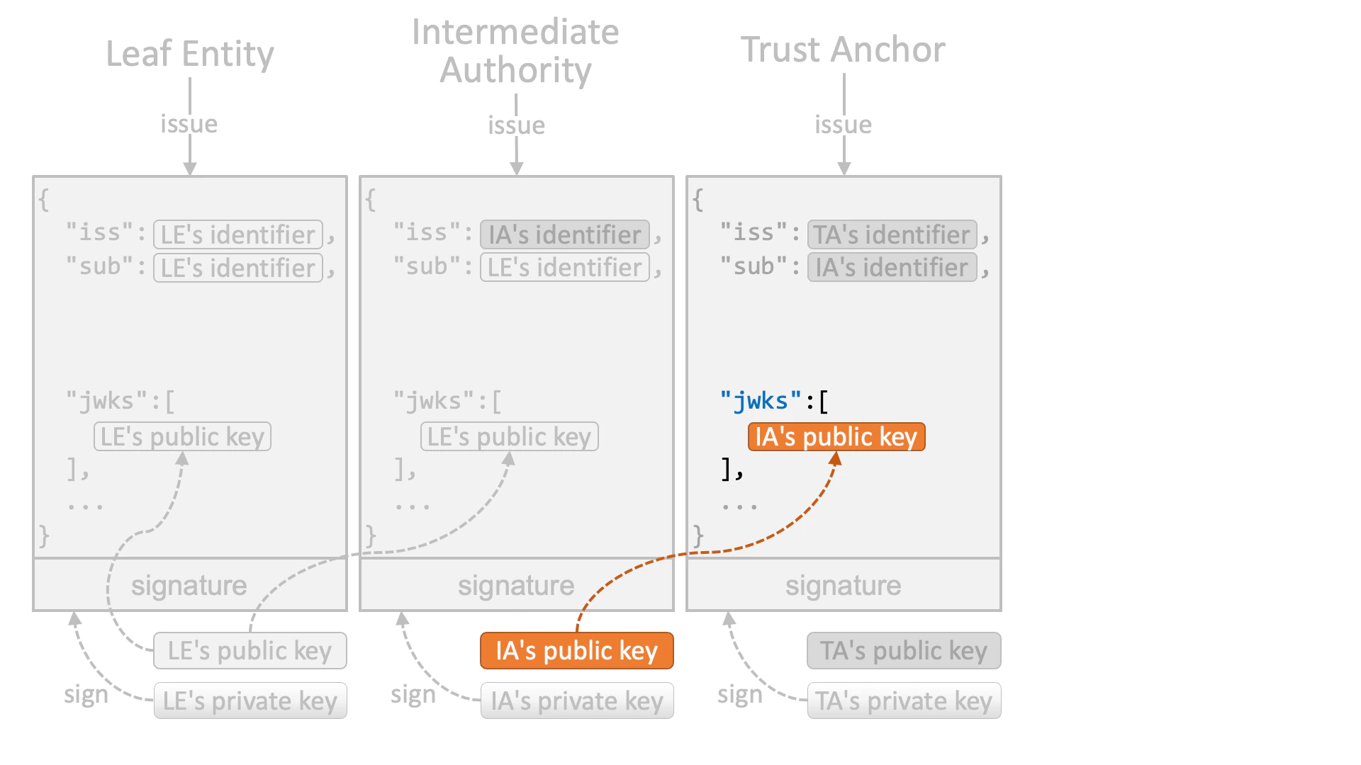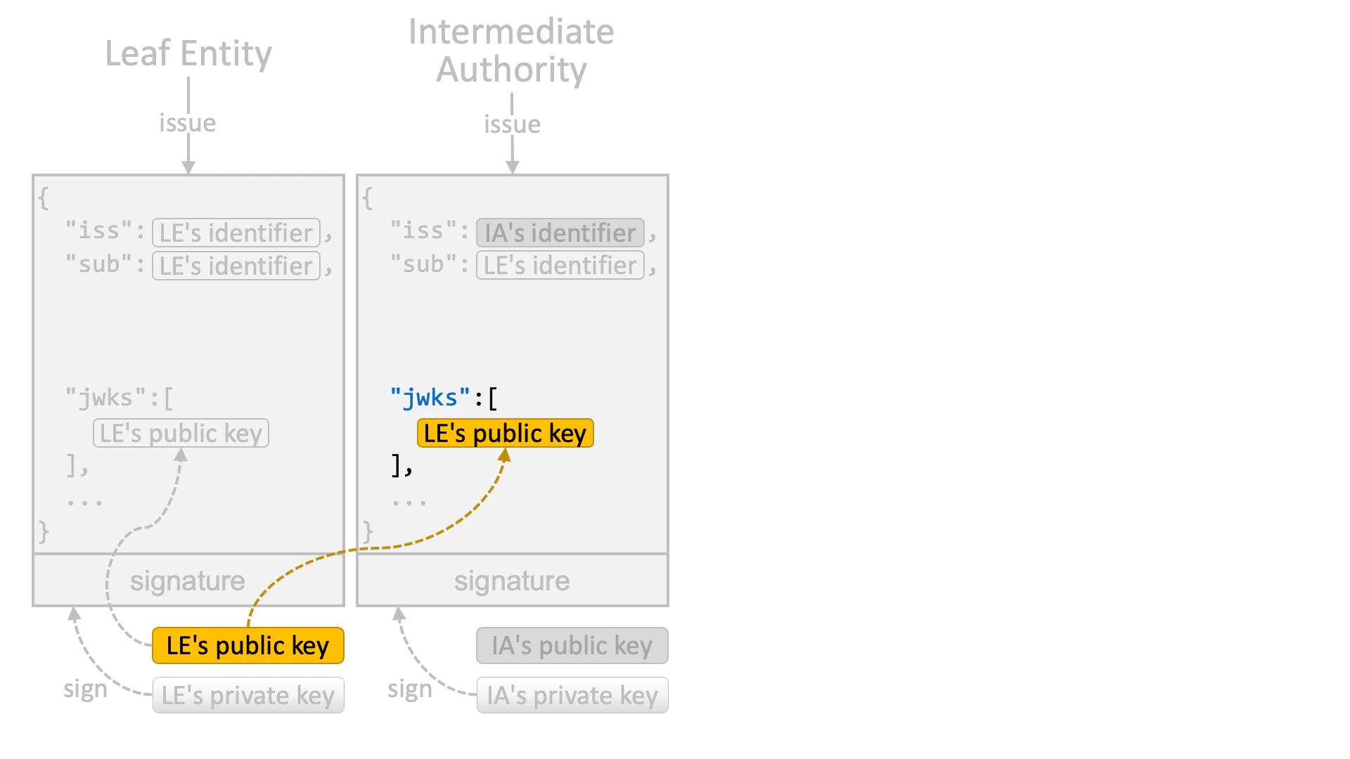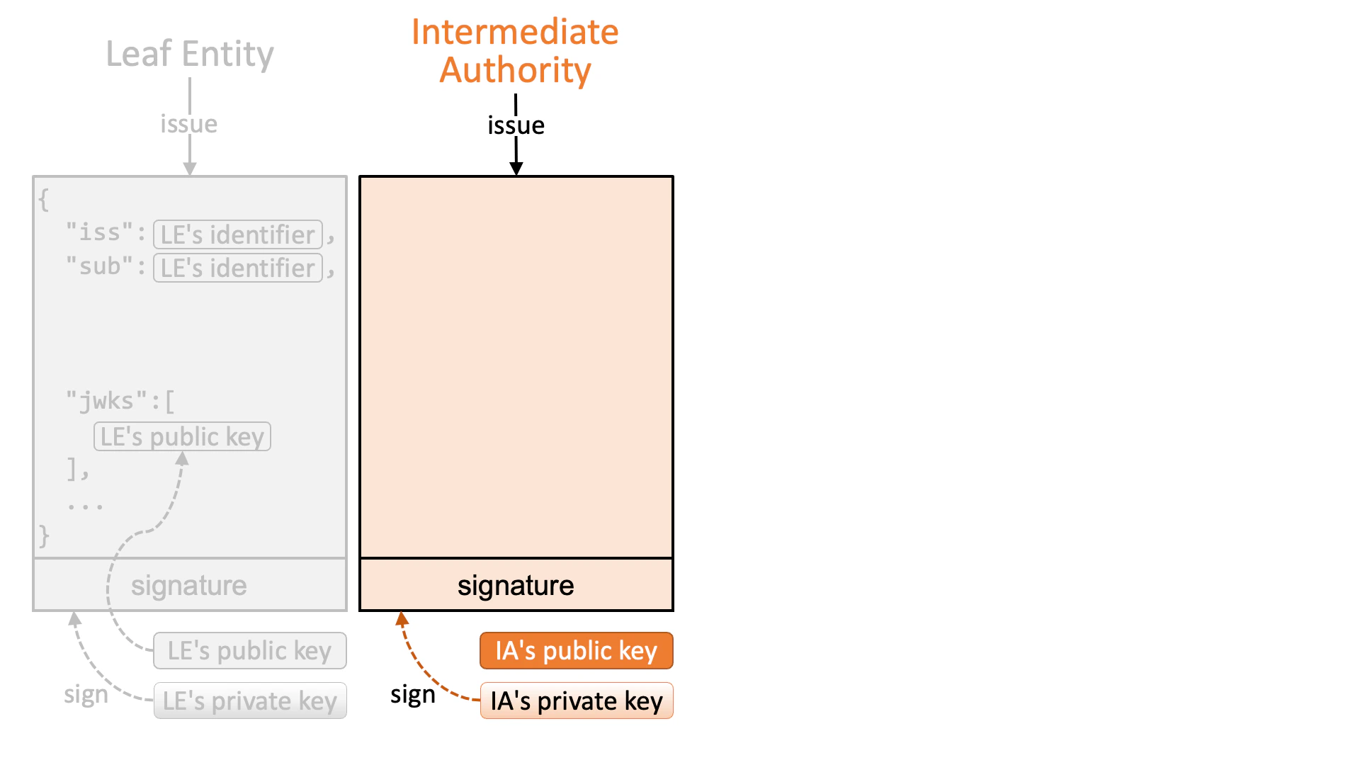 An intermediate authority (or a trust anchor if no intermediate authority exists in a trust chain) that authorizes the leaf entity issues a JWT that is signed by the intermediate authority’s private key.