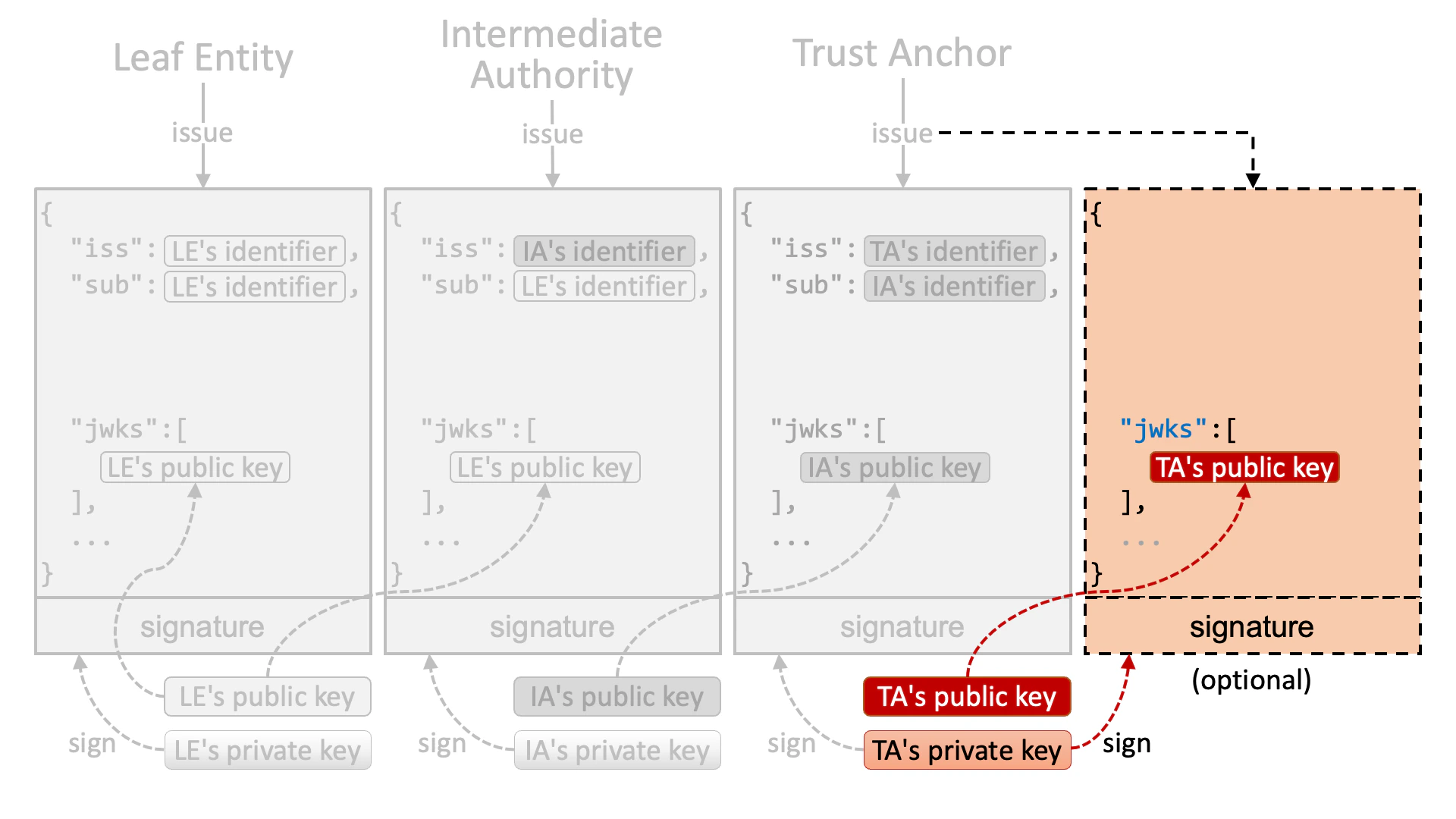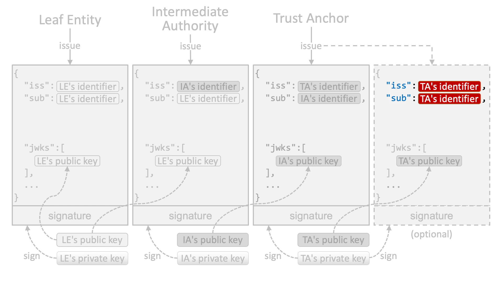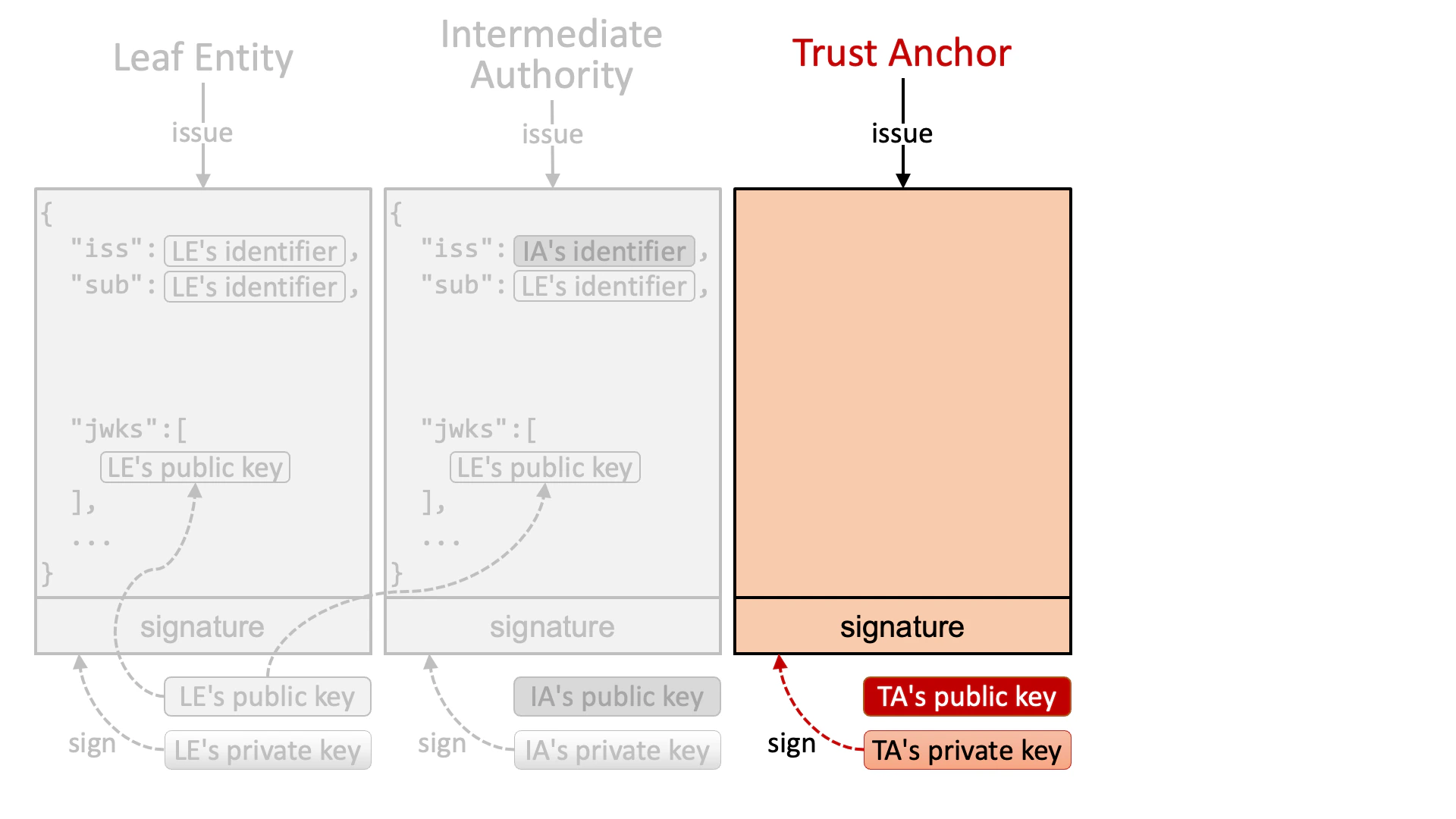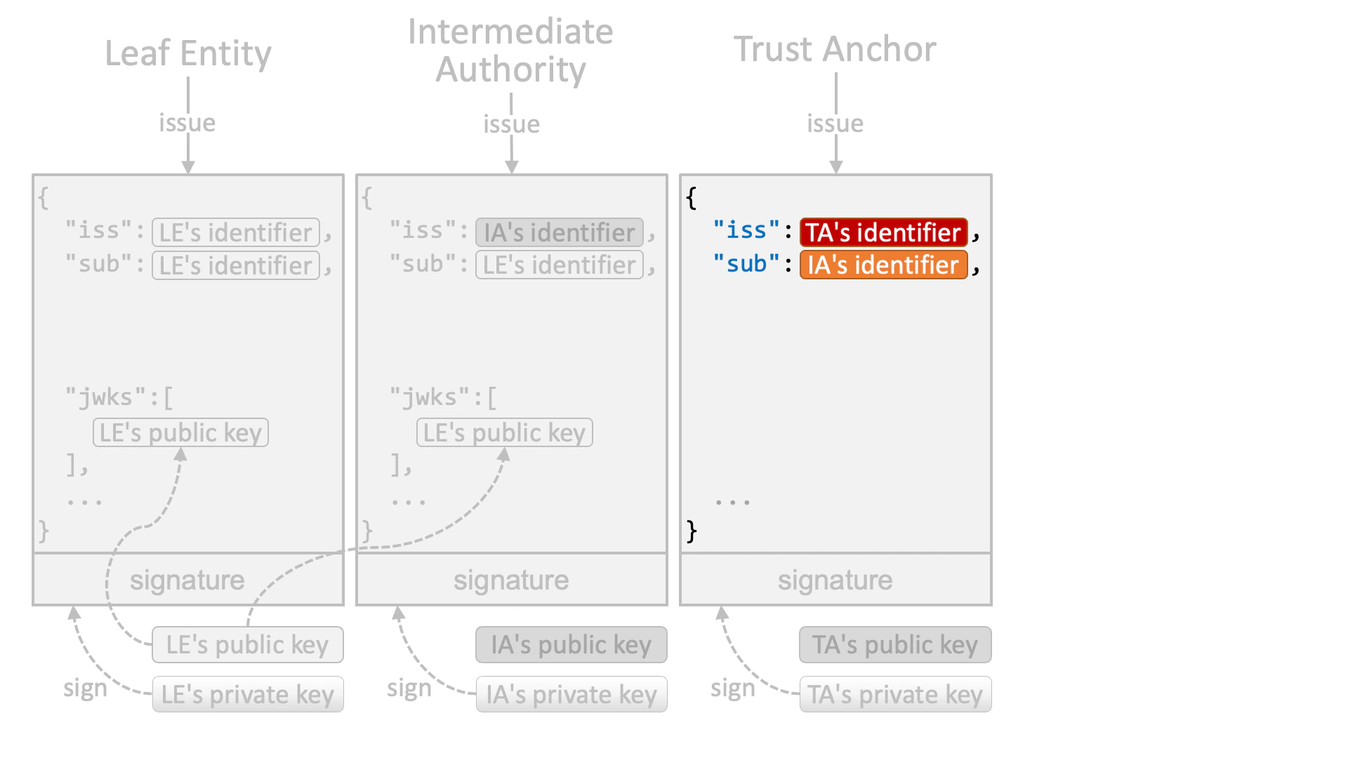 An intermediate authority (or a trust anchor if no intermediate authority exists in a trust chain) that authorizes the leaf entity issues a JWT that is signed by the intermediate authority’s private key.