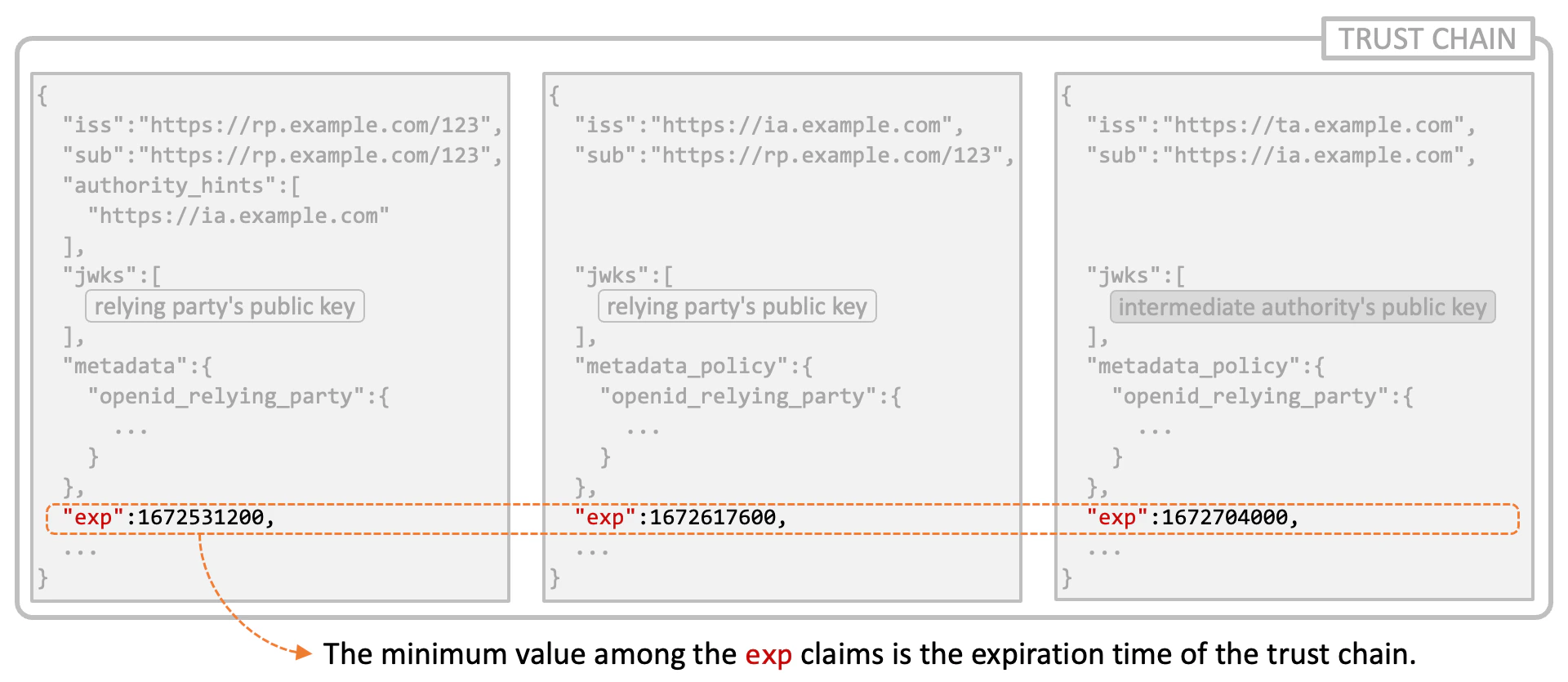 All entity statements in a trust chain include theexp claim (Expiration Time; RFC 7519 Section 4.1.4) as the OpenID Federation specification requires so. The minimum value among the exp claims is regarded as the expiration time of the trust chain.